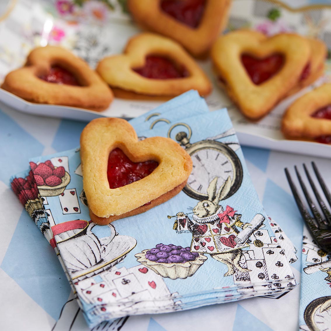 Blue illustrated Alice in Wonderland Cocktail Napkins by Talking Tables. This pack of 20 small paper napkins are perfect for a Mad Hatter Tea Party, birthday, picnic or garden party! Pair with our 'Alice in Wonderland' range of Alice in Wonderland themed tableware and decorations to complete the look. Size: 25cm x 25cm unfolded / 10" x 10".