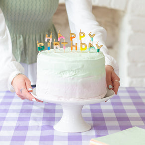 These adorable birthday candles spell out 'Happy Birthday' with rainbow letters dipped in gold. Perfect for any birthday cake, no matter the age.