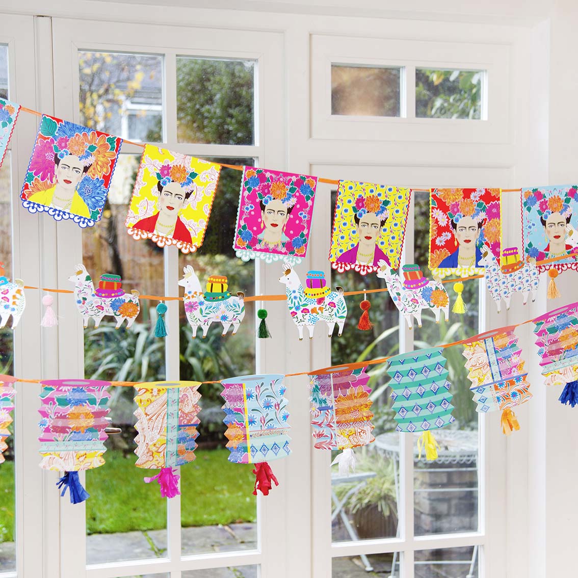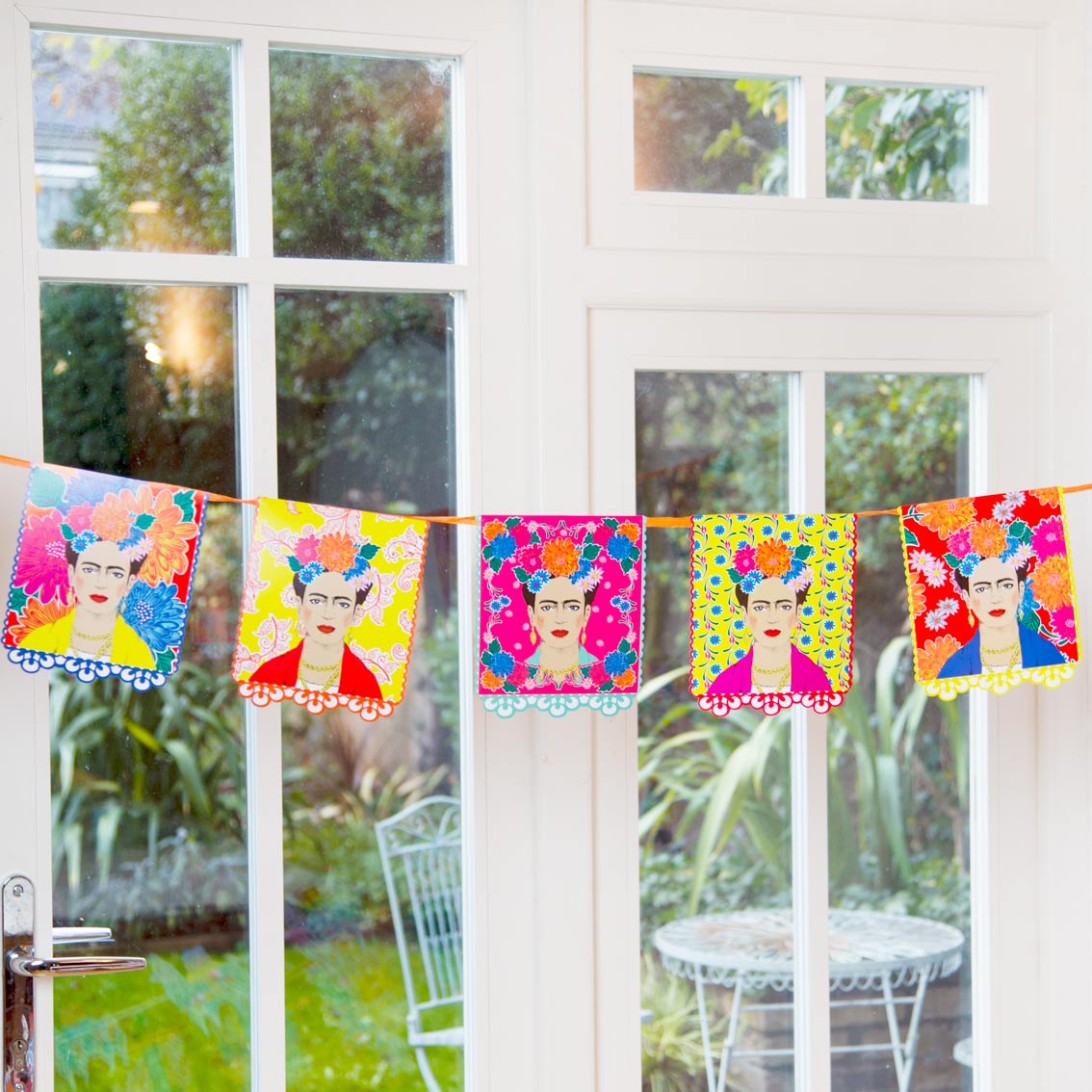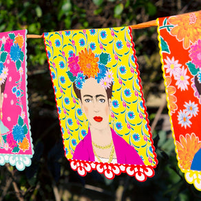 Frida Kahlo Paper Garland by Talking Tables. This party decoration features 6 different colourful Frida portraits with bohemian flowers. This garland is double-sided, simply hang on the wall, in the garden or across the ceiling to create a bohemian atmosphere that your guests will love! Perfect for a boho themed birthday party, fiesta, Mexican Party, Cinco de Mayo celebration or summer garden party. Pair with the rest of our Frida Kahlo themed tableware and decorations to complete the look. Size: 3m (10ft) in length with 12 card pennants.