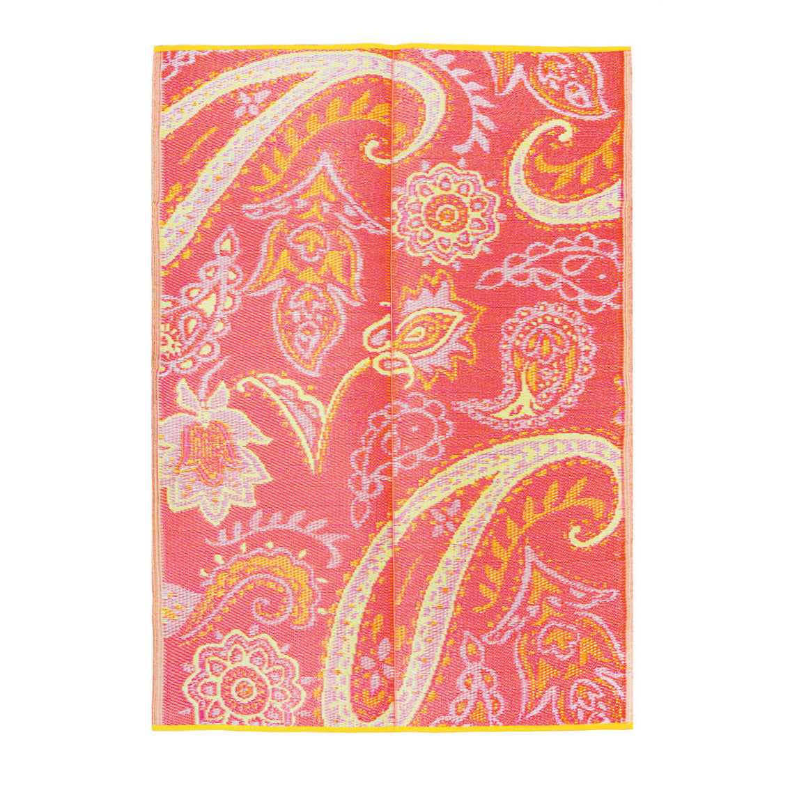 In vibrant shades of pink, orange and yellow, this paisley print rug is ideal to sell in a home decor store or gift shop. Display alongside our other colorful outdoor rugs for your customers to pick their favorite or merchandise with our matching fabric bunting and paisley tablecloth to inspire a bright boho display in your online or physical store.