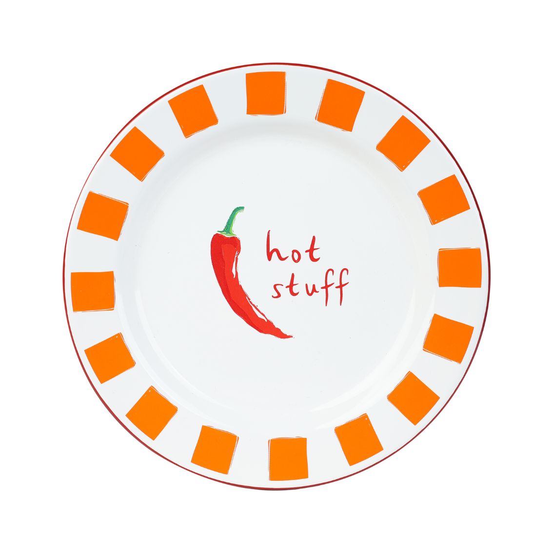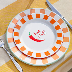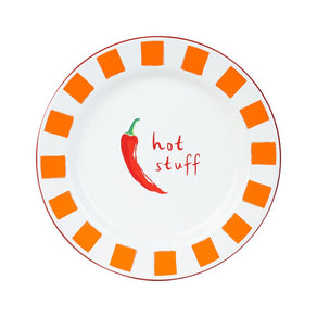 Add heat to your homeware range with this Chilli Enamel Plate. Featuring a bold red chilli and the phrase “Hot Stuff”, this fiery design taps into the growing chilli trend seen across gifting and kitchenware. Each plate is made from heavy-grade steel, hand dipped in enamel multiple times and fired at high temperatures to achieve its glossy, durable finish. Hardwearing and shatterproof, this reusable plate is perfect for both everyday meals and outdoor dining.