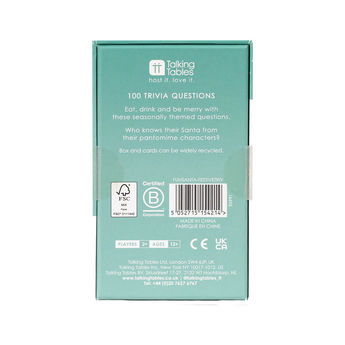 Help customers bring fun to the table this Christmas with the new Talking Tables Festive Trivia game. With questions about holidays, celebrations and traditions, this game is great as an ice-breaker or as a welcome interlude between courses.  Our Christmas Festive Trivia Game comes in a box slightly larger than a deck of playing cards and features 50 cards with questions front and back.