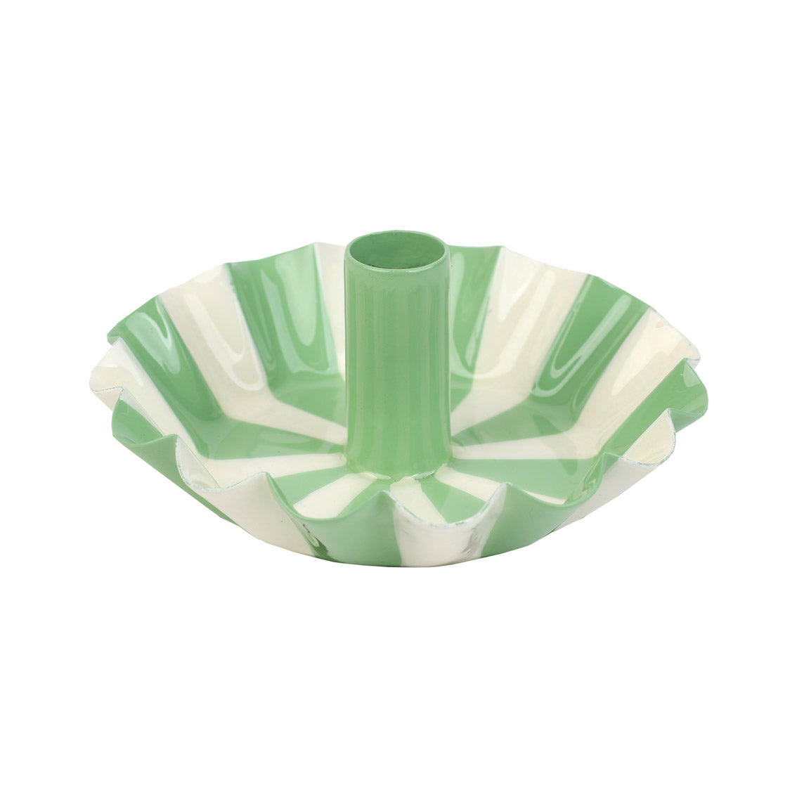 New for SS26, the Green & White Stripe Metal Dinner Candle Holder offers a fresh, modern update to our popular scalloped candle holders Handmade in India, each piece is crafted from durable metal and finished with alternating hand-painted green and cream enamel stripes — applied one by one for a unique, artisanal finish. The scalloped edge design adds soft texture and shape to any tablescape, while the glossy enamel coating gives it a premium, long-lasting finish.