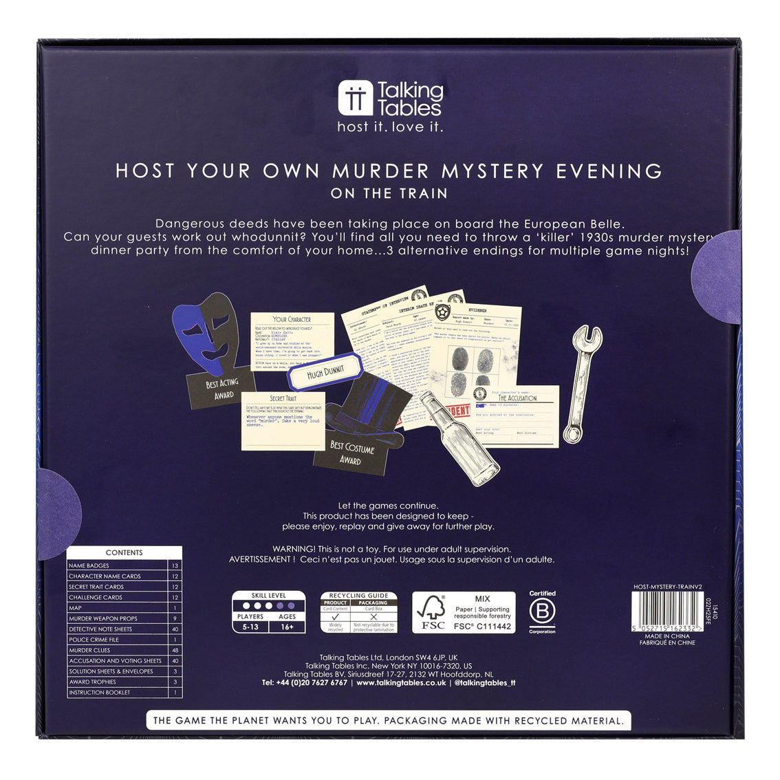 Step aboard for an evening of vintage glamour and suspense. Set on a 1930s-inspired train, this immersive murder mystery game lets players slip into character, uncover clues, and expose the killer before the final stop. With three alternate endings, it's perfect for themed dinner parties, costume nights, or family game evenings.