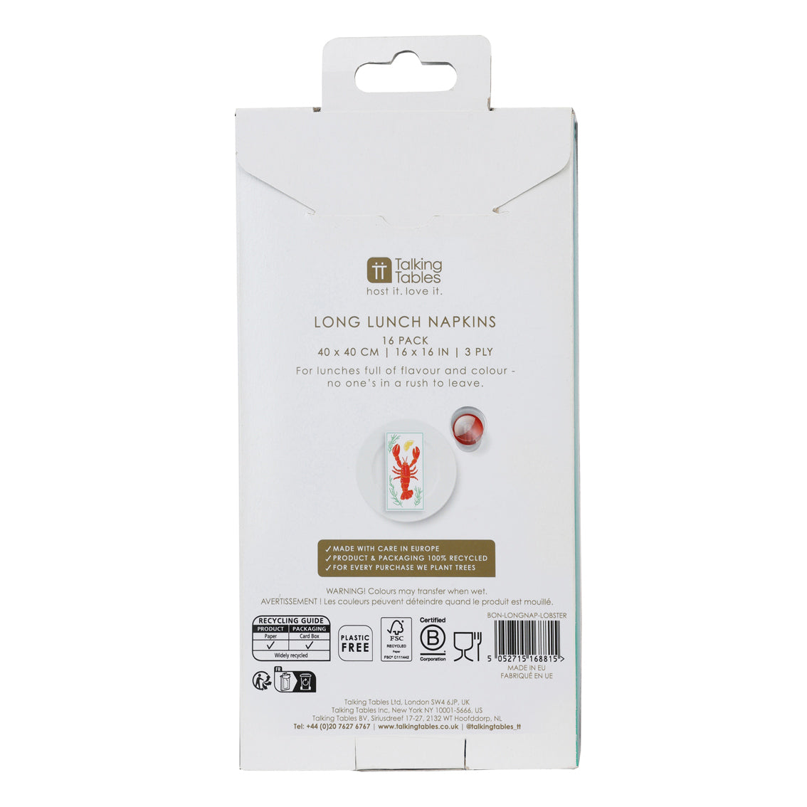 New for SS26, these Lobster Long Lunch Paper Napkins introduce a fresh Talking Tables icon to the Bon Appetit collection. Building on the success of the sardine motif, the lobster design celebrates the growing Fishermancore and Crustaceancore trends seen across homeware, fashion and dining. Each napkin features a bold woodcut-style lobster illustration paired with a slice of lemon and soft coastal greenery, brought to life in the Bon Appetit color palette of coral reds, citrus yellows and cool greens. Made from 3 ply, 100% FSC® recycled material, these 40cm napkins feature two coordinating prints — a statement lobster design and a nautical stripe reverse — offering flexibility for table styling.