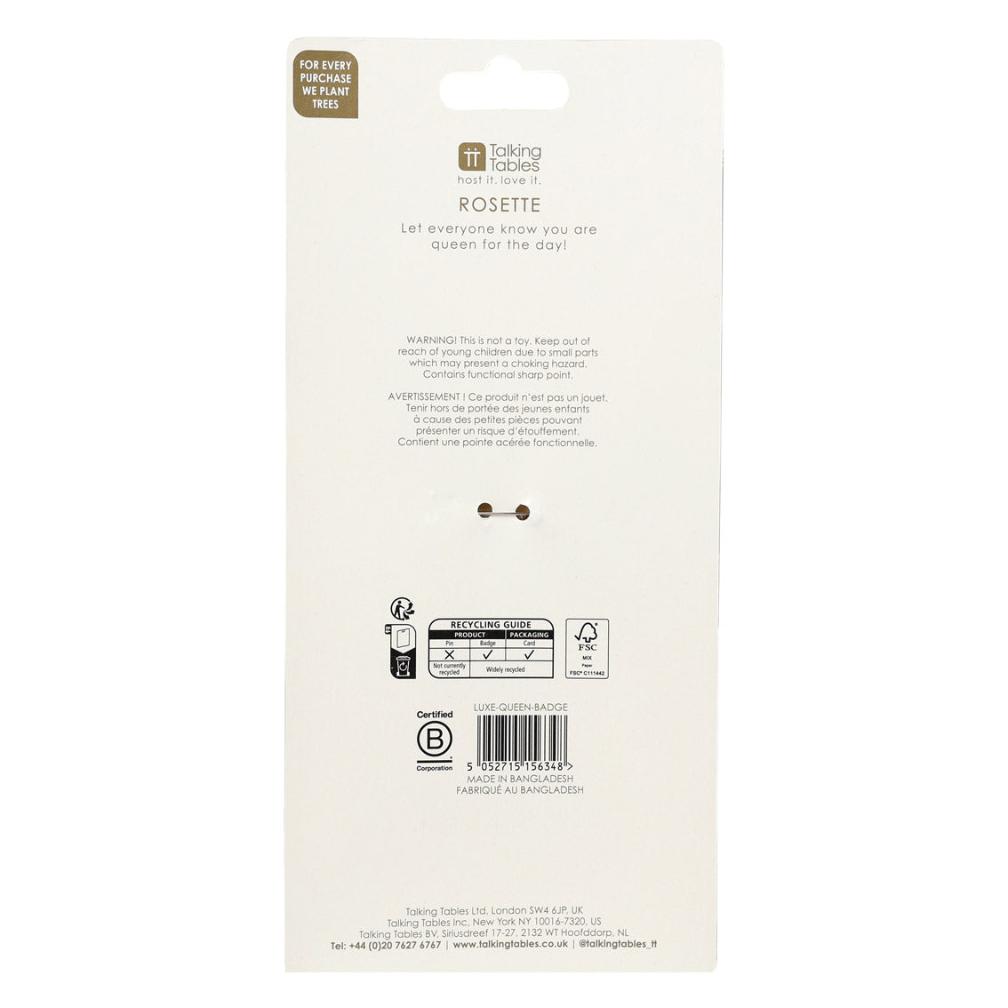 This luxe, rosette badge is a sweet way for customers to make a fuss of a loved one on their special day. Made from sustainable card in pretty pastel stripes, it’s printed with ‘Queen for a day’ and can be fixed with the metal pin at the back.