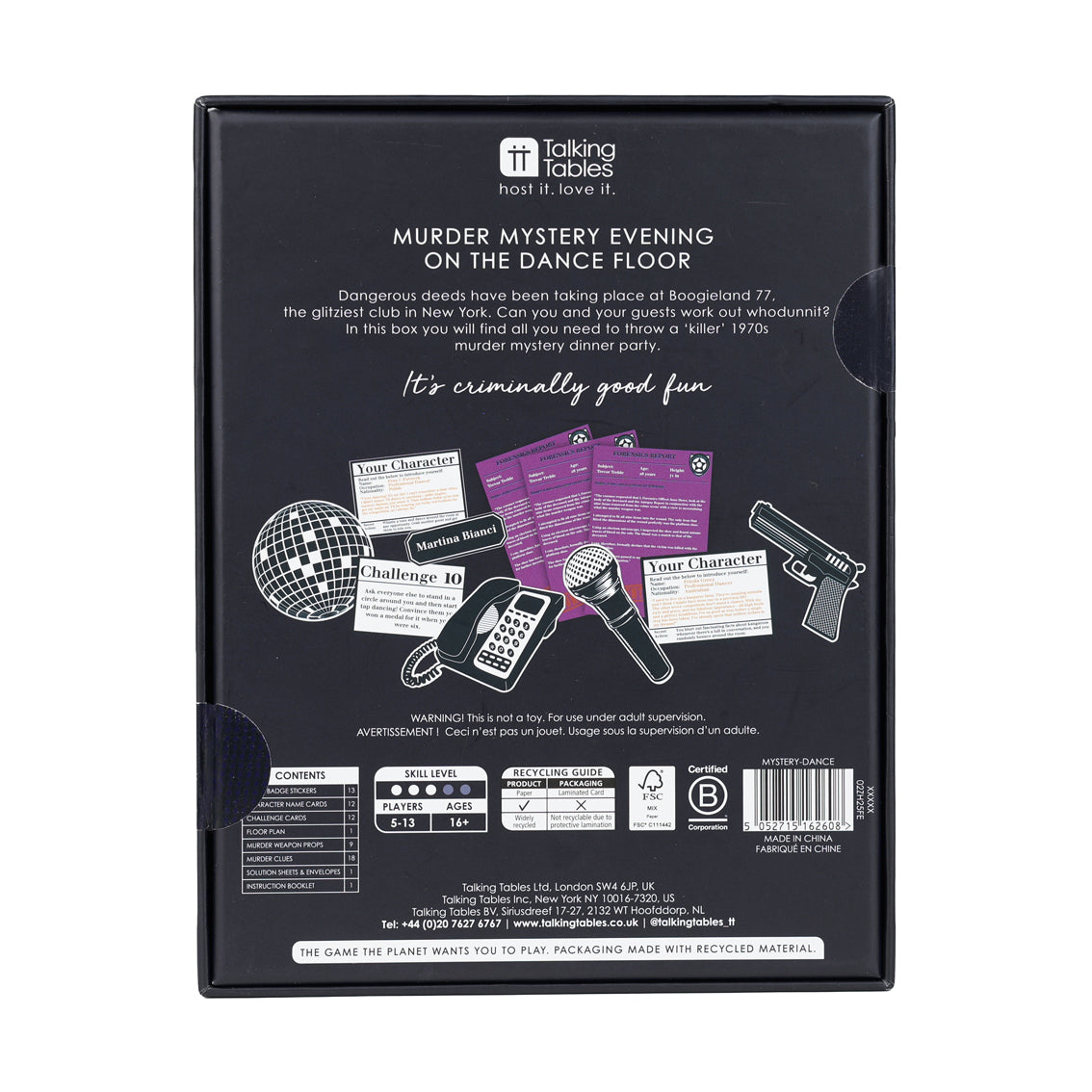 Disco meets danger in this compact murder mystery game. With a funky cast of characters, glittering storyline, and unexpected twists, Murder Mystery on the Dancefloor is your go-to game for retro-themed gatherings. Designed for smaller groups, this portable box delivers all the drama and fun of a full game night—perfect for party hosts or gifting.