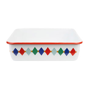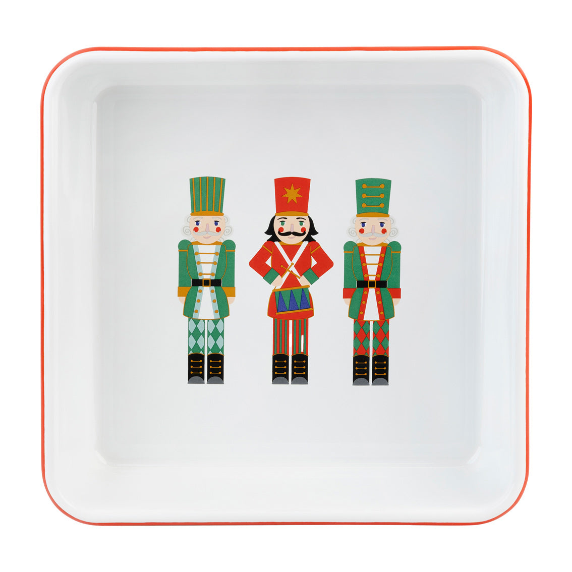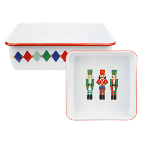 Made from durable enamel, this roasting tin is suitable for everyday use and ideal for roasting vegetables, baking brownies or preparing seasonal dishes. The exterior features a bold diamond and star motif, while the inside showcases three Nutcracker characters, creating a standout piece that looks good both in use and on display.