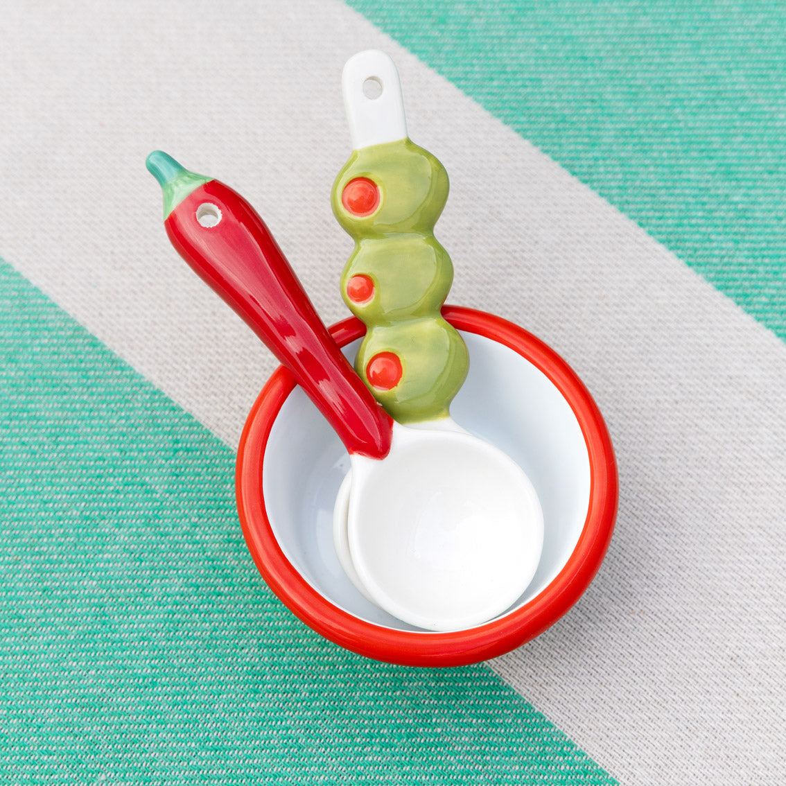 Part of the Bon Appetit collection, these Olive & Chilli Ceramic Spoons capture the charm of bistro-style dining with a playful twist. Hand-painted with vibrant, glossy glazes, each spoon features a distinctive design — one shaped like a string of green olives, the other like a bright red chilli. Crafted from durable stoneware, they balance practicality with decorative appeal, ideal for adding a touch of fun to the table.