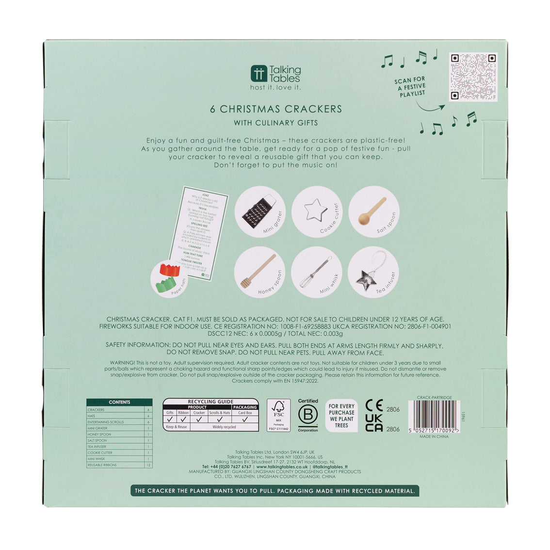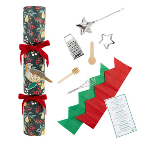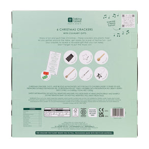 Game Contents: 6 Crackers, 6 Hats, 6 Entertaining Scrolls, 1 Mini Grater, 1 Honey Spoon, 1 Salt Spoon, 1 Tea Infuser, 1 Cookie Cutter, 1 Mini Whisk, 12 Reusable Ribbons
