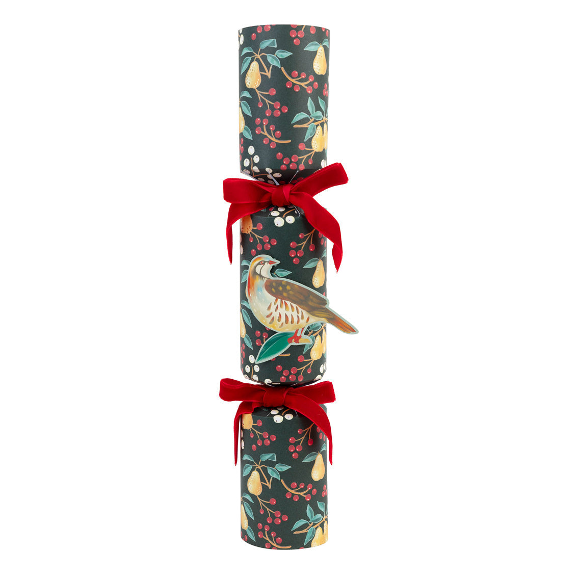 Designed to create a rich, festive table moment, these Partridge & Pear Christmas crackers balance classic Christmas charm with a fresh illustrated style. The folk inspired design features partridge birds, pears, foliage and ribbon details set against deep forest green, warm reds and soft neutrals. Gold foil accents and a die cut partridge decoration add depth and texture, while luxury velvet ribbon ties give each cracker a premium, gift like finish. Filled and assembled by hand, these crackers are made for hosts who want something decorative and practical for Christmas Day.