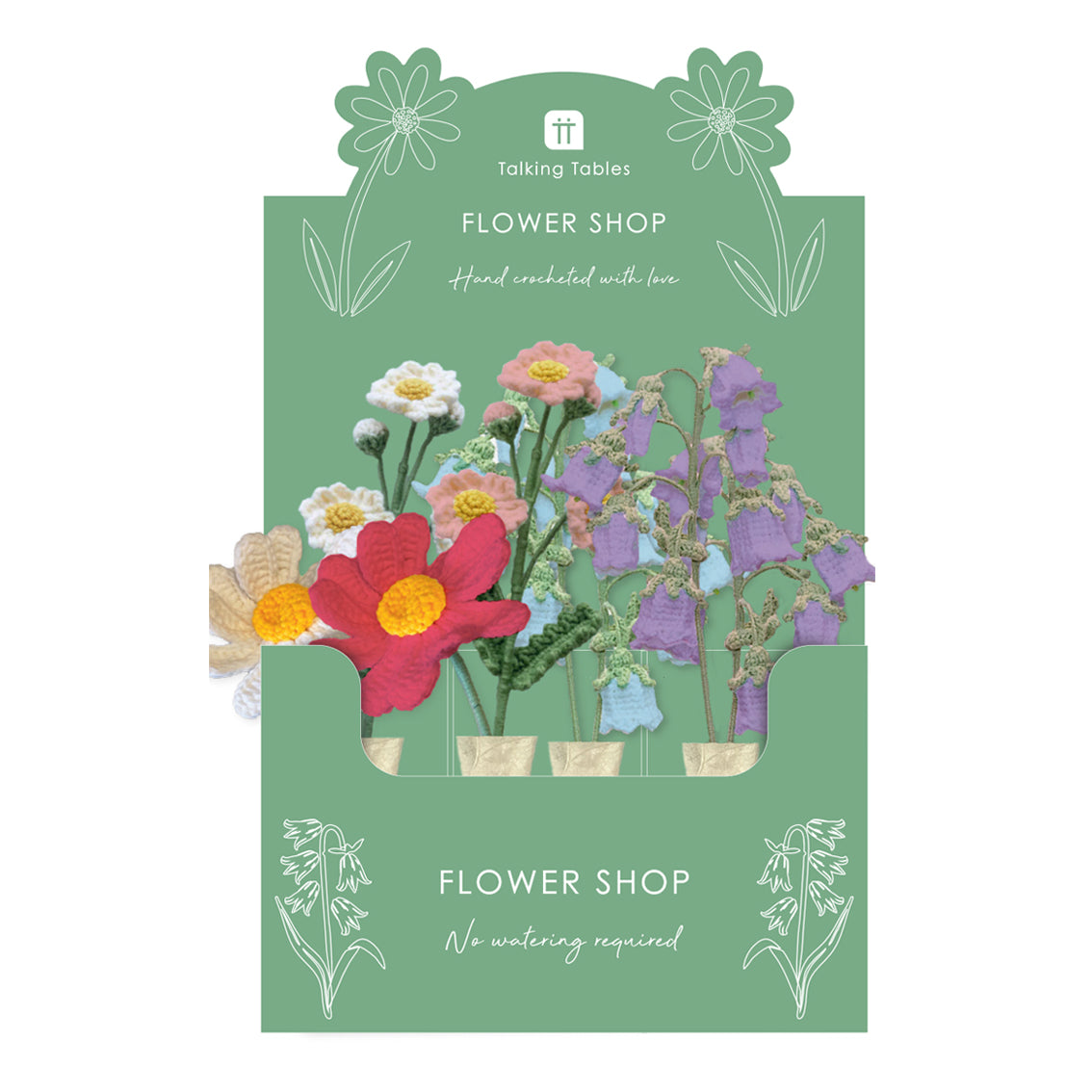 A curated selection of handmade crochet florals presented in a lovely “Flower Shop” display. Each sprig is crafted from long-lasting cotton and hand crocheted in Vietnam, showcasing intricate detail and artisanal craftsmanship. The mix of bright daisies and delicate bellflowers adds colour and texture for spring gifting and home decor.