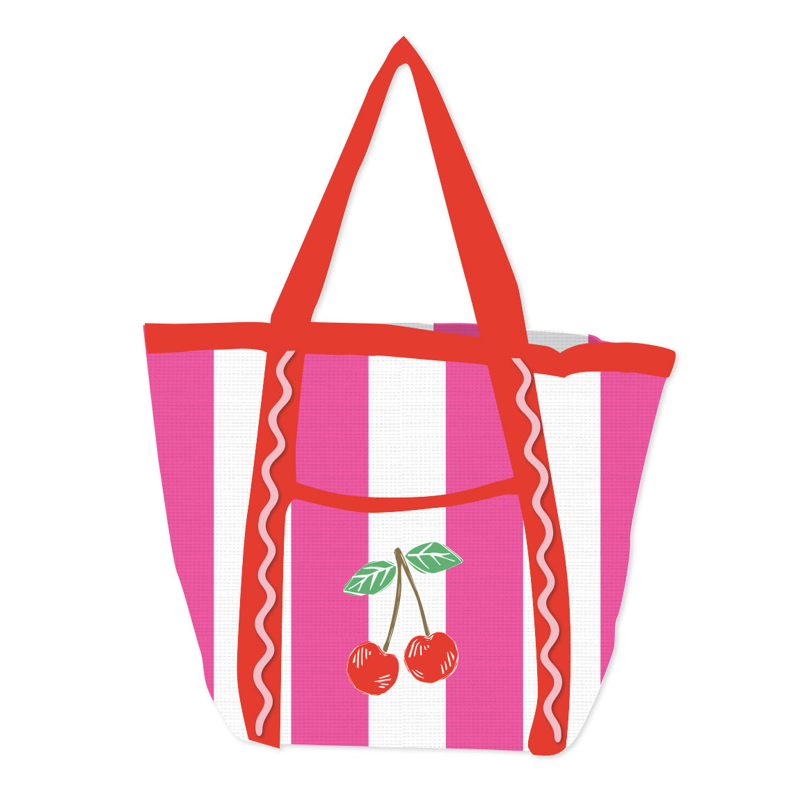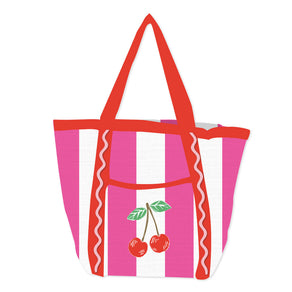 Made for every adventure, this Recycled Plastic Cherry Tote Bag combines trendy design with practicality and purpose. Crafted from recycled plastic materials, each bag is made by transforming used cement bags into durable, water-resistant threads that are woven into strong new fabric. The bold pink and white striped design is finished with an embroidered cherry motif and playful ric-rac trim, bringing a fun, fashion-led twist to an everyday essential.