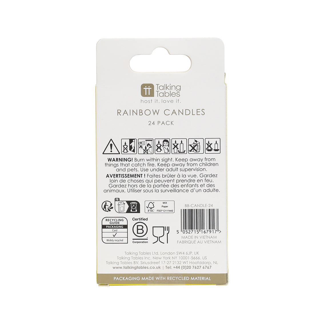 Make any cake pop with this pack of 24 rainbow candles. Each 10.5cm candle is made from paraffin wax and features a bright, bold colour, perfect for adding fun to any celebration. Easy to keep in your drawer and bring out for that special occasion, these candles add a cheerful finishing touch to cakes for all ages.
