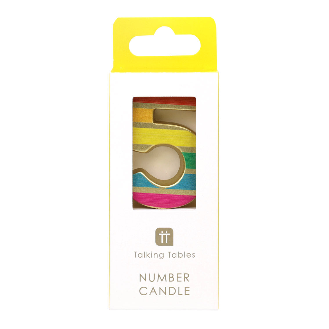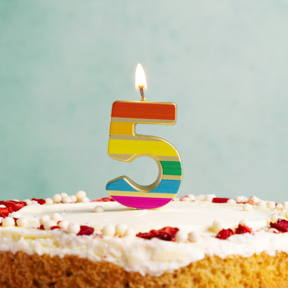 Add a bright touch to your customers birthday cakes with our new 5 rainbow number candle. Designed to bring colour and excitement to any birthday celebration and a must-have for bakeries, party shops and gift shops. The multicolored numbers and striped design will suit birthday cakes of all ages and genders.