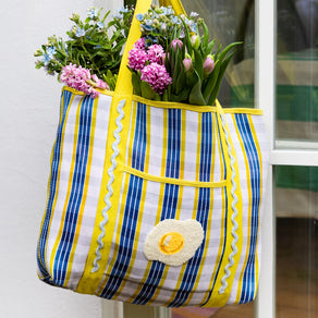 The egg is a playful spring-summer icon, reimagined here in a fun, quirky design that adds character to this Recycled Plastic Egg Tote Bag. Made from recycled plastic materials, each bag is crafted by transforming used cement bags into durable, water-resistant threads woven into a strong new fabric. Featuring a yellow and blue striped pattern, ric-rac trim, and an embroidered fried egg motif, it’s a bold yet practical accessory that captures the light-hearted spirit of the season.