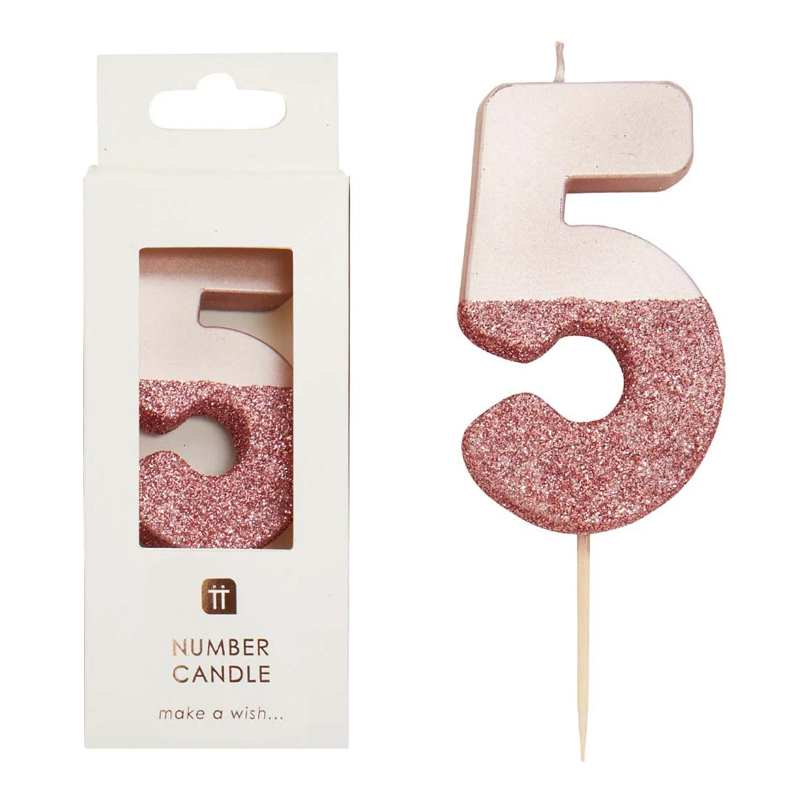 Rose Gold number 5 birthday candle dipped with glitter by Talking Tables. Add some sparkle to your birthday cake with this stylish number 5 birthday candle cake decoration. The perfect cake topper for a birthday celebration or anniversary. Mix and match this number 5 candle with other numbers to get your desired age. Our number birthday candles are also available in silver, gold, blue and pink. Numbers 0 to 9 available. Size - (US) 5in x 2.3in x 0.8in, (UK & EU) 13.8 cm x 5.2cm x 2cm.