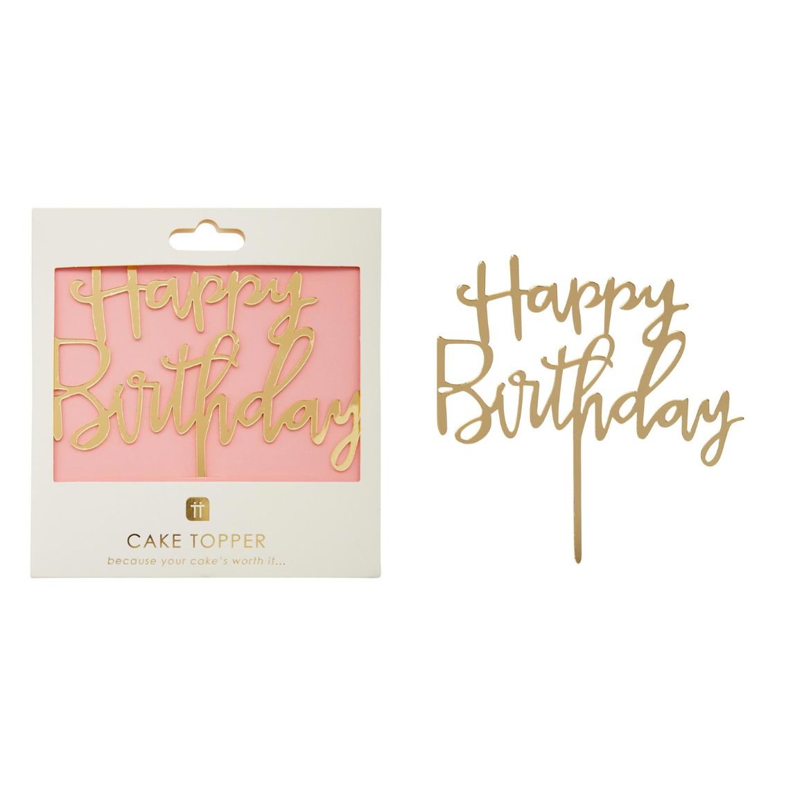 Gold Happy Birthday Cake Topper by Talking Tables. Add the finishing touches to any birthday cake with this cake decoration, suitable for kids and adults of all ages! This cake topper is reusable, simply wipe clean with a damp cloth to use again.