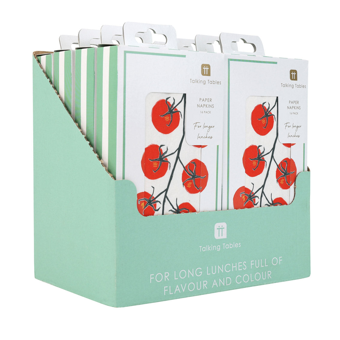 Display in the printed display unit for strong shelf presence or pair with other tomato-themed items including enamel bowls, plates, and trays from Talking Tables’ Bon Appetit range.