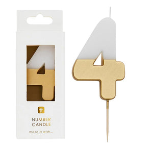 This number 4 white and gold candle is perfect for adding a stylish touch to any birthday cake. Ideal for a Wedding Anniversary or Milestone Birthday! We have number candles from 0-9 so you can combine them to create any age or number.