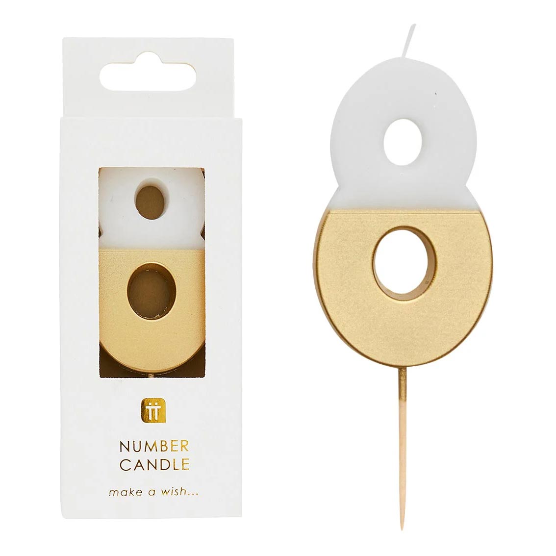 This number 8 white and gold candle is perfect for adding a stylish touch to any birthday cake. Ideal for a Wedding Anniversary or Milestone Birthday! We have number candles from 0-9 so you can combine them to create any age or number.